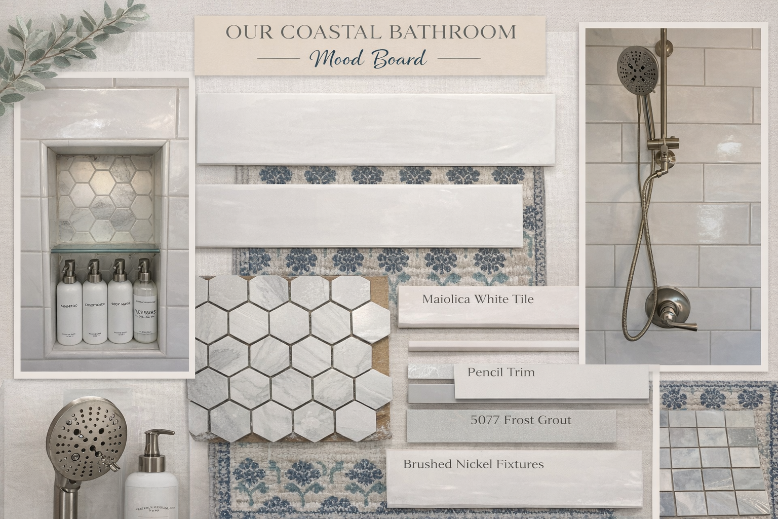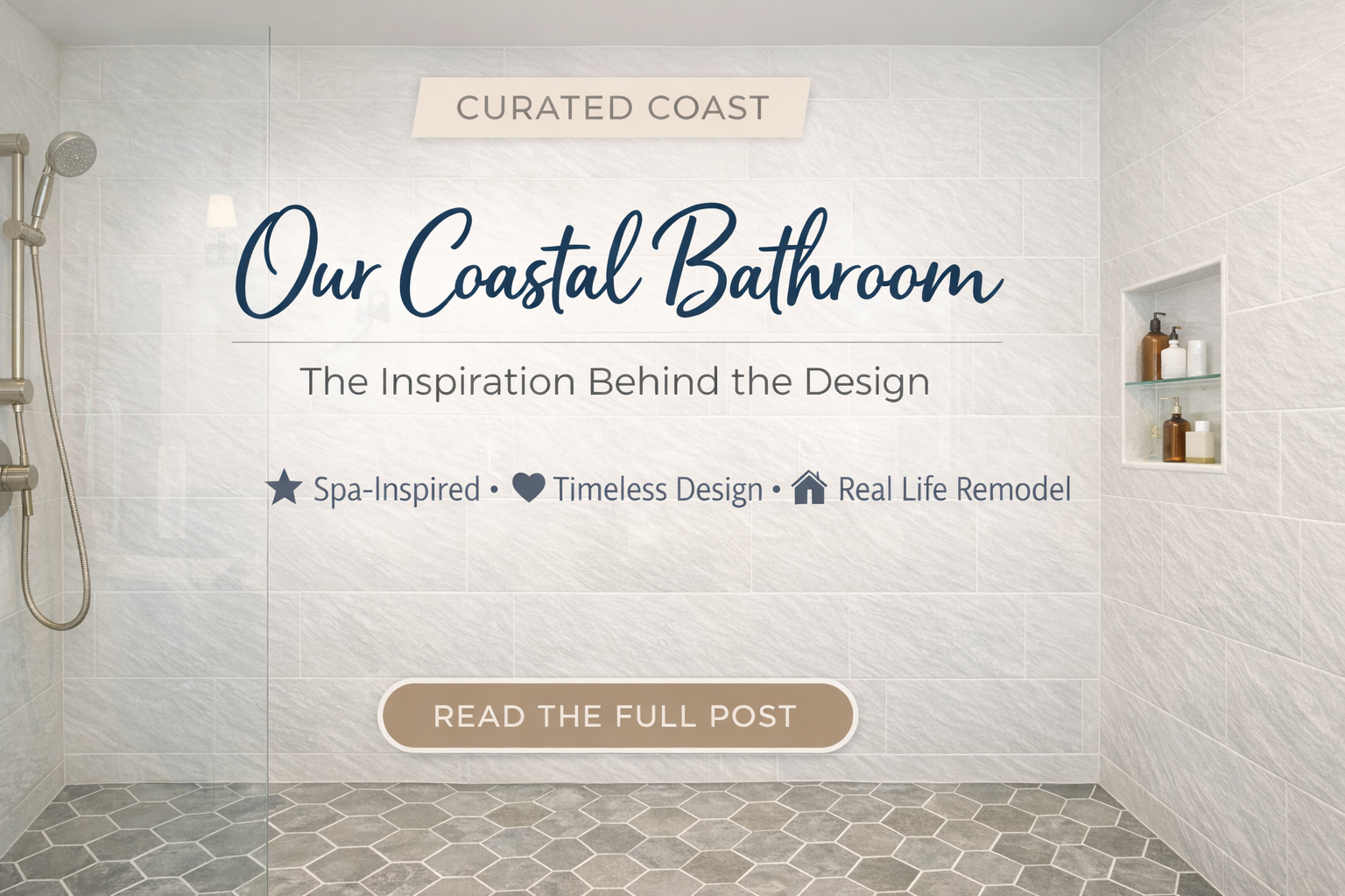 Wall Tile: Large-format porcelain with subtle texture. The texture adds just enough interest without competing with the calm, coastal vibe.