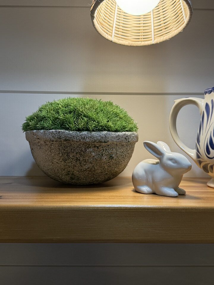 I brought out a set of blue and white dishes from Pottery Barn that I’ve always loved and placed them on the shelves so they could be both decorative and functional. We use them daily, which makes the shelves feel practical rather than purely decorative. I also added greenery for softness and a bit of life.
